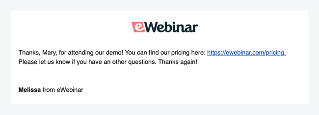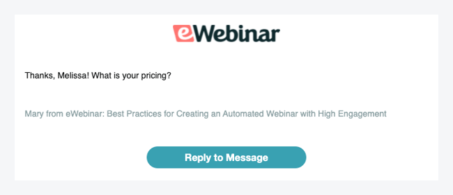 A continuación, puede añadir algo que ayude a gestionar las expectativas sobre el tiempo de respuesta, como "Si no podemos ponernos en contacto con usted durante el seminario web, nos aseguraremos de ponernos en contacto con usted por correo electrónico lo antes posible".