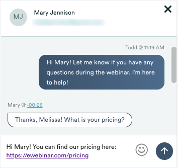 Si Melissa hace clic en una notificación del navegador de escritorio o en el botón de respuesta de una notificación por correo electrónico, es llevada a nuestro administrador del chat, donde puede chatear con Mary desde el eWebinar: