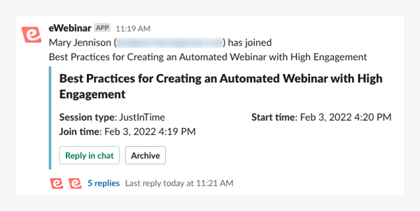 Una vez que haya configurado la integración directa de eWebinar con Slack, podrá responder a los mensajes de los asistentes desde los canales dedicados de Slack sin tener que iniciar sesión en nuestra plataforma. Cualquier persona añadida a estos canales de Slack puede responder a los mensajes de los asistentes, independientemente de si se ha añadido o no al eWebinar como moderador oficial.