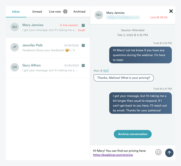 5. Si el seminario web termina o Mary se va antes de que Melissa pueda responder, Mary recibirá la respuesta de Melissa por correo electrónico.