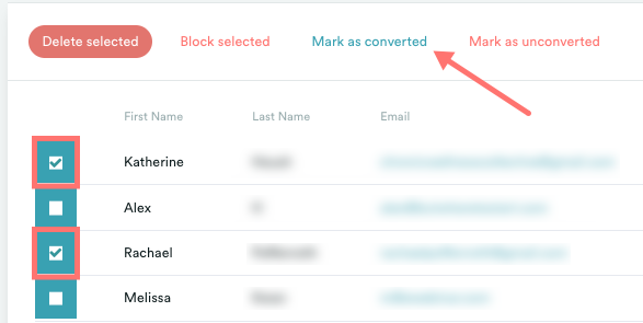 Para ello, vaya a la pestaña de inscritos de su seminario web, marque la casilla junto al asistente o asistentes en cuestión y haga clic en Marcar como convertido.