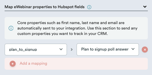 En la parte inferior de la tarjeta de integración verás un mapeador de propiedades. Si necesitas enviar cualquier otra información a tu objeto Contacto puedes hacerlo mapeando las propiedades de eWebinar a los campos de contacto de Hubspot. Un mapeo tiene el siguiente aspecto: