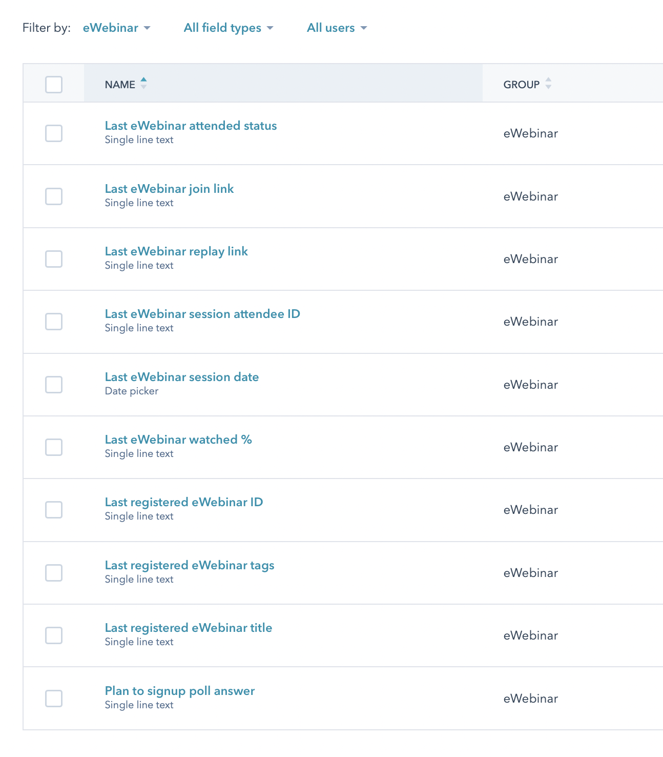 Estos son los campos creados dentro de un nuevo grupo de propiedades eWebinar: