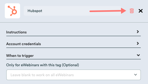 - A desconectar por completo la integración, haz clic en Hubspot para abrir la integración en una ventana modal y, a continuación, haz clic en el icono de eliminación en la esquina superior derecha.