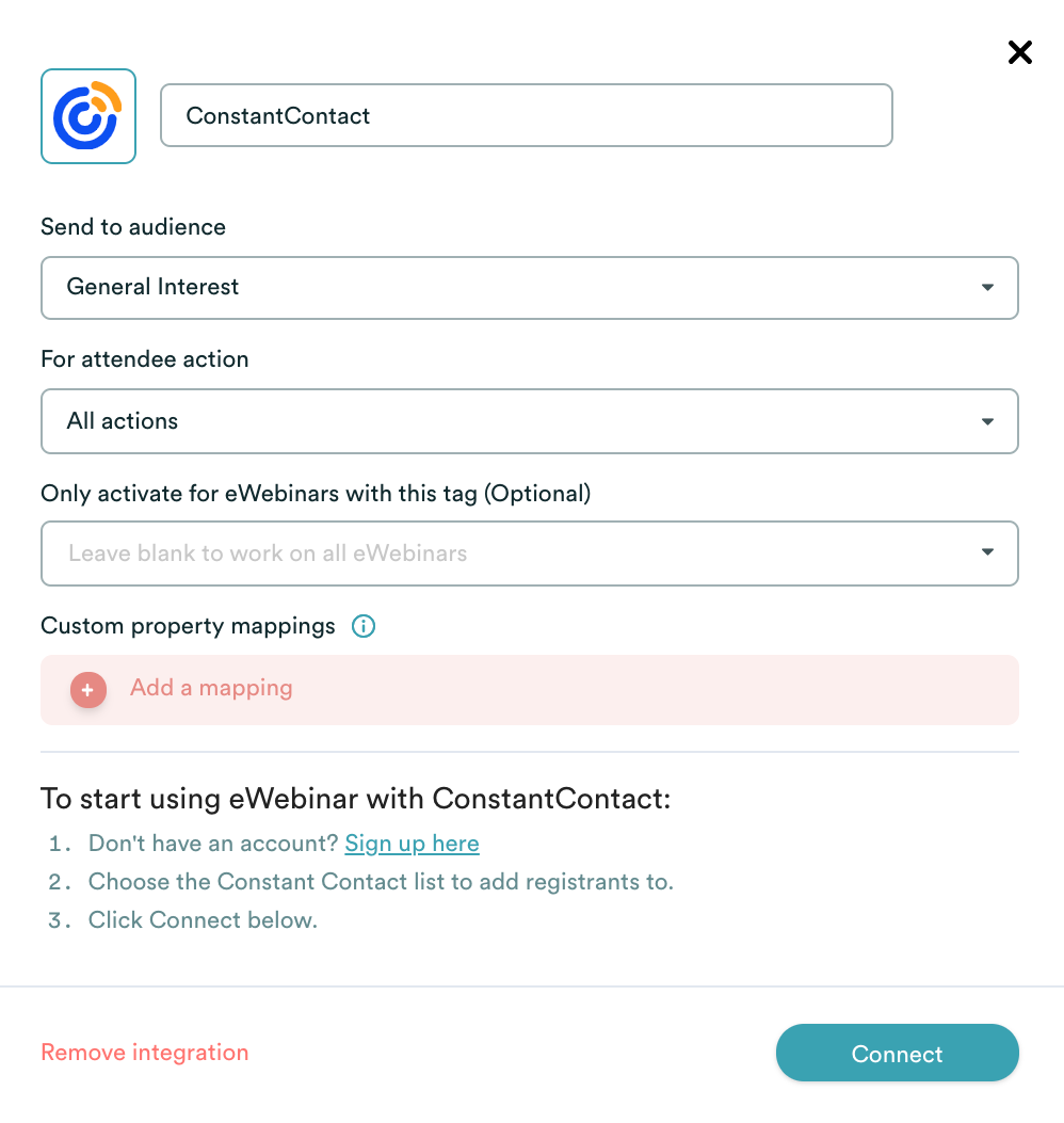 Al integrar eWebinar con Constant Contact, los inscritos y los asistentes al evento se añadirán automáticamente a una lista de correo electrónico de su elección para que pueda automatizar el marketing posterior al webinar y enviar contenido personalizado a las bandejas de entrada adecuadas con facilidad.