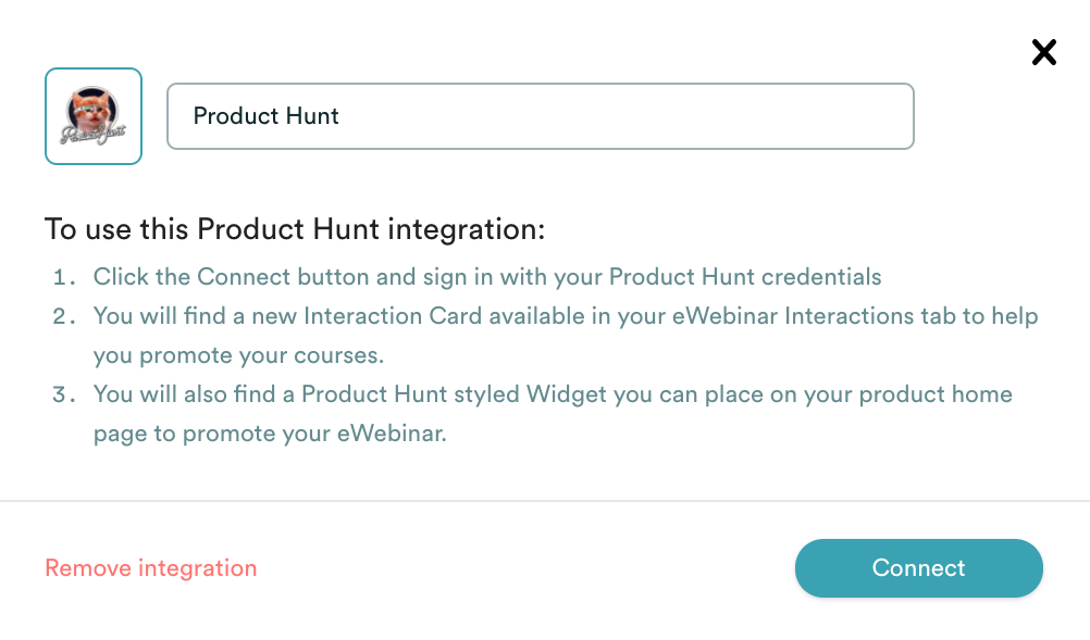 Cuando integra eWebinar con Product Hunt, obtiene acceso a una plantilla de seminario web que puede utilizar para dar vida a su lanzamiento en Product Hunt y a una tarjeta de interacción hecha para dirigir el tráfico a su puesto de lanzamiento.