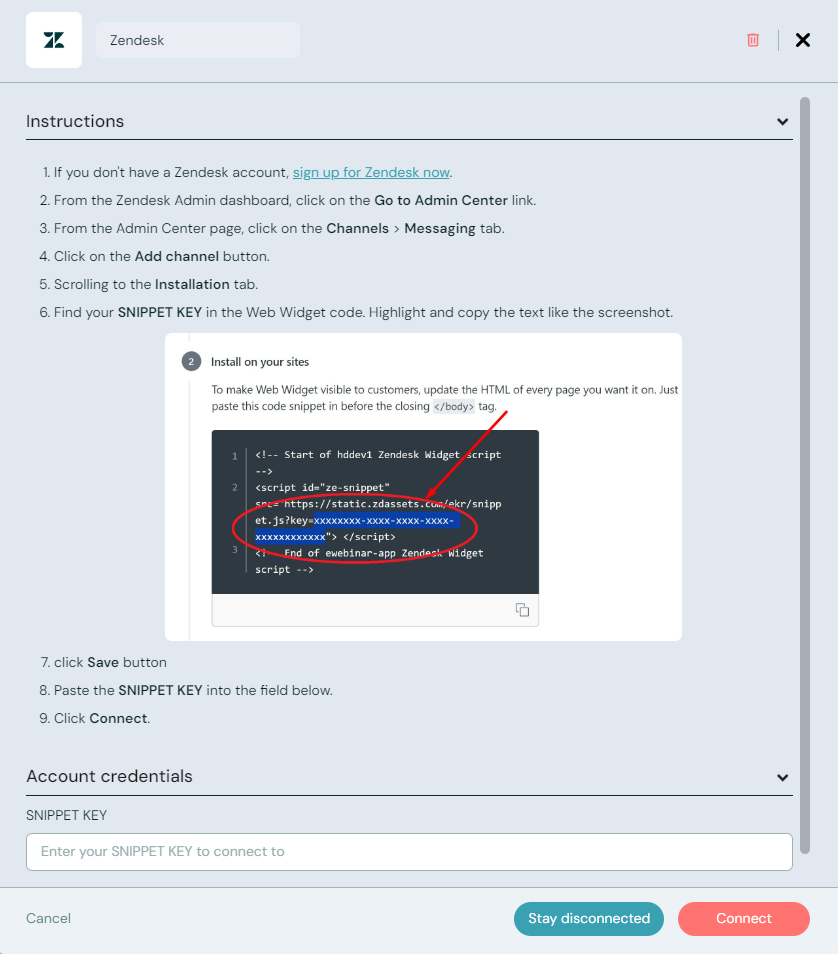 Para configurar la integración con Zendesk, inicie sesión en su cuenta de eWebinar (o regístrese para obtener una versión de prueba gratuita) y, a continuación, haga clic en Integraciones en el menú del perfil, haga clic en Zendesk en Integraciones disponibles y pegue la CLAVE SNIPPET de Zendesk.